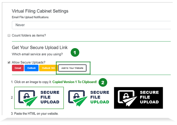Select a logo version that you want to display on your website (2). Each logo contains your unique secure file upload link when clicked on. For safekeeping, you can copy and paste link to a text file (i.e. Notepad) to be used for Step 3.